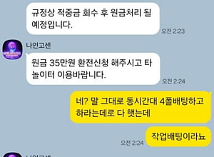 이새끼들 개 악질임 가용장 문제있다고 기다려달라해서 2주넘게 기달림 그러더니 아이디 막고 가입한 코드 문제다 이딴 소리 하면서 아이디 사용제한 걸어 놓고 상부인지 총판한테 말하니깐 오늘안에 줄게 이번주안에 줄게 개인돈이라도 모아서 줄게 이소리하더니 잠수 끝까지 간다 나는 지옥끝까지